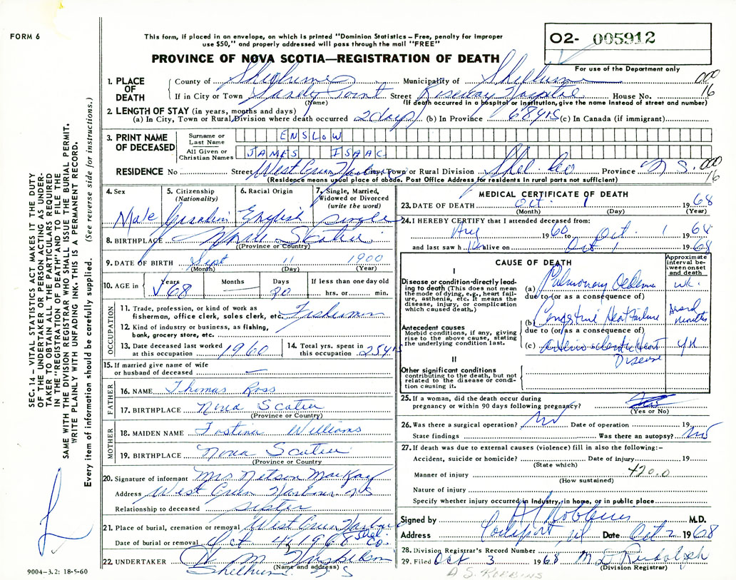 Death Registration: Year: 1968 number: 5912