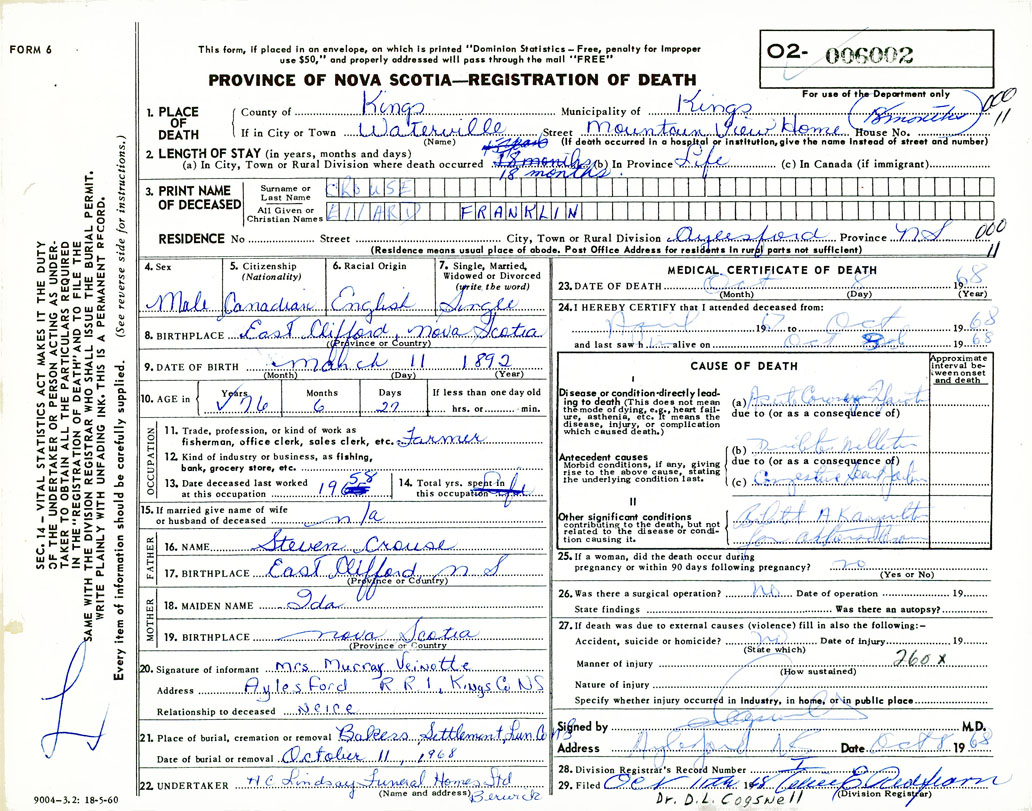 Death Registration: Year: 1968 number: 6002