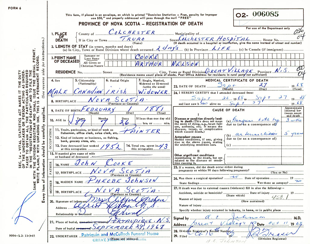 Death Registration: Year: 1968 number: 6085