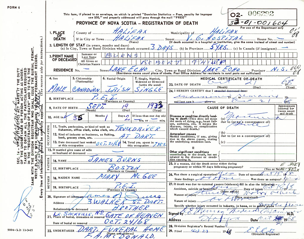 Death Registration: Year: 1968 number: 6292