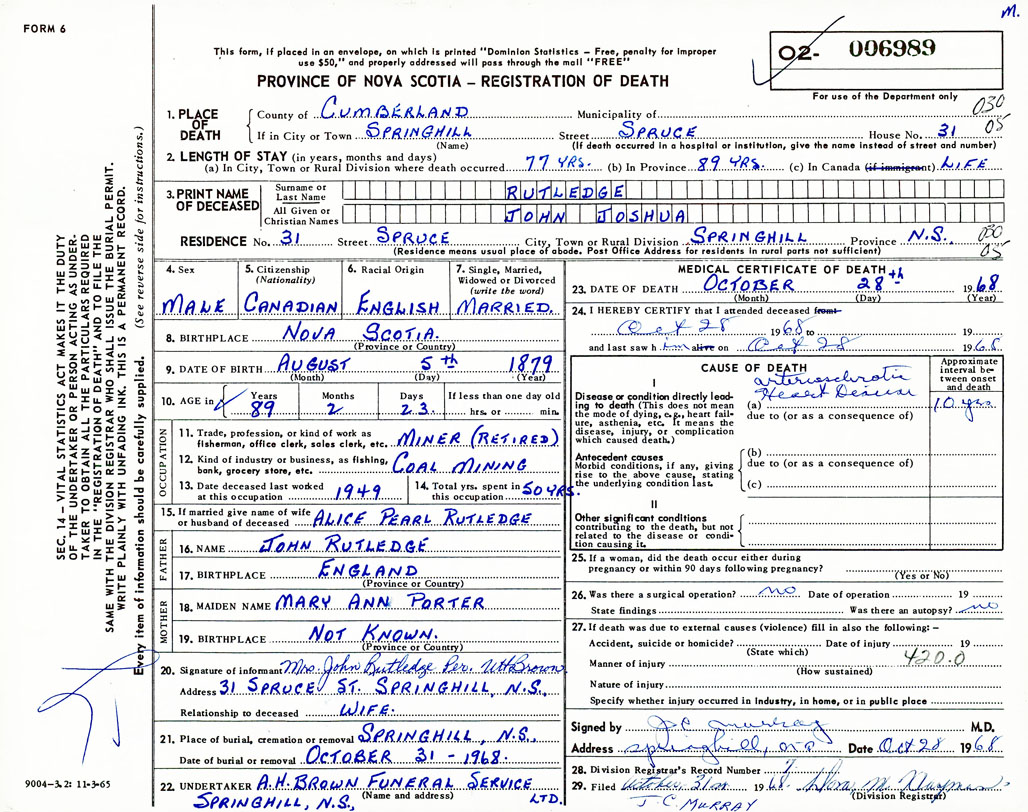 Death Registration: Year: 1968 number: 6989