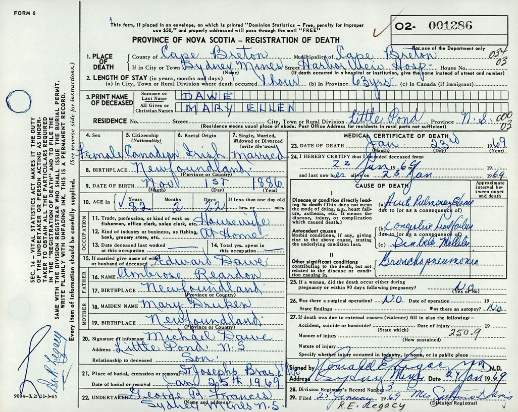 Death Registration: Year: 1969 number: 1286