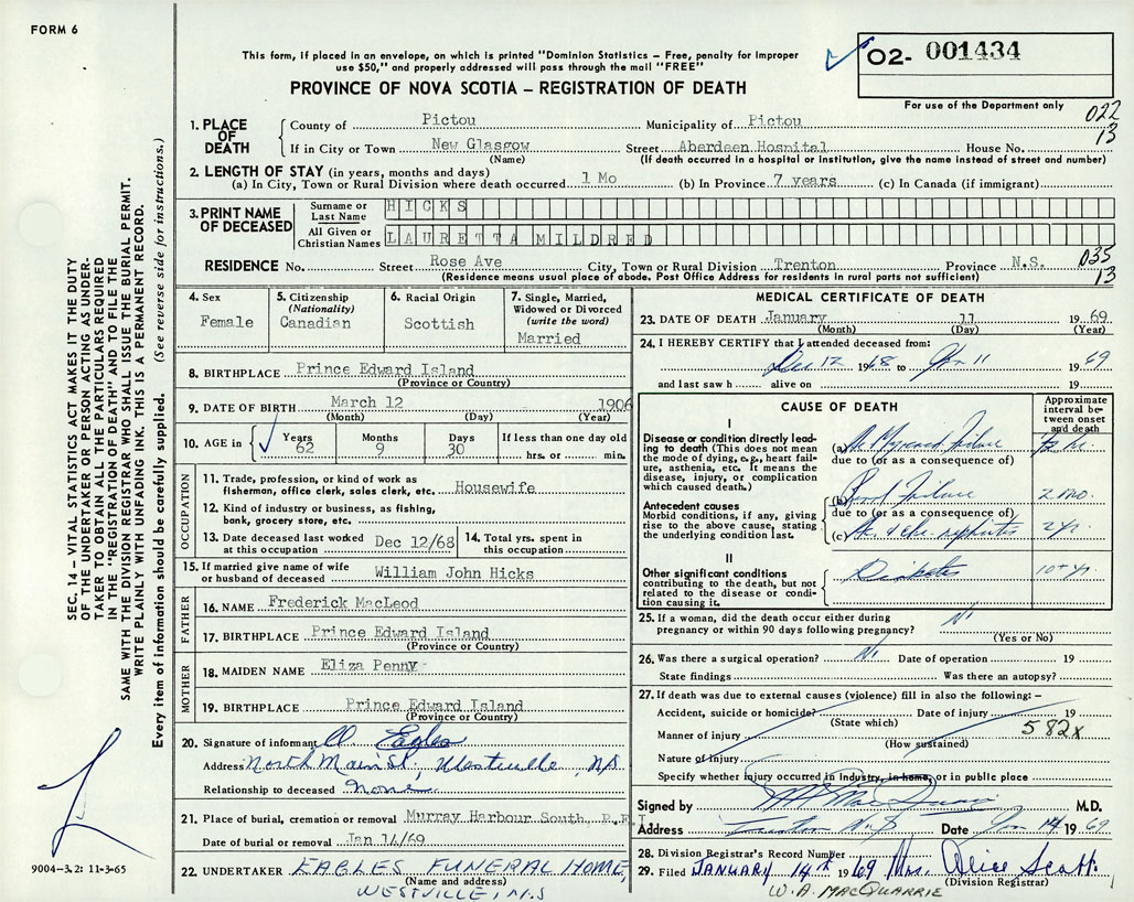 Death Registration: Year: 1969 number: 1434