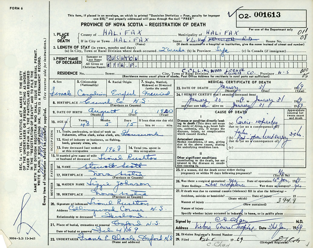 Death Registration: Year: 1969 number: 1613