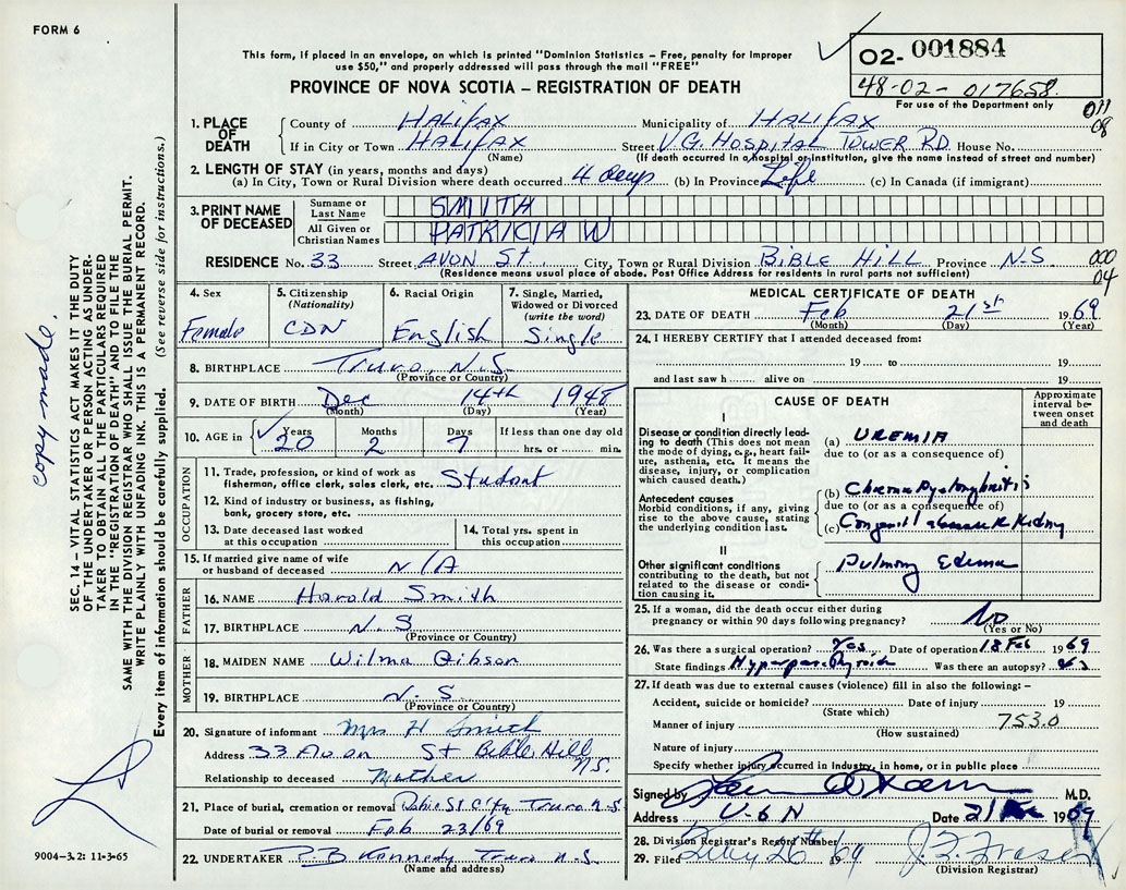 Death Registration: Year: 1969 number: 1884