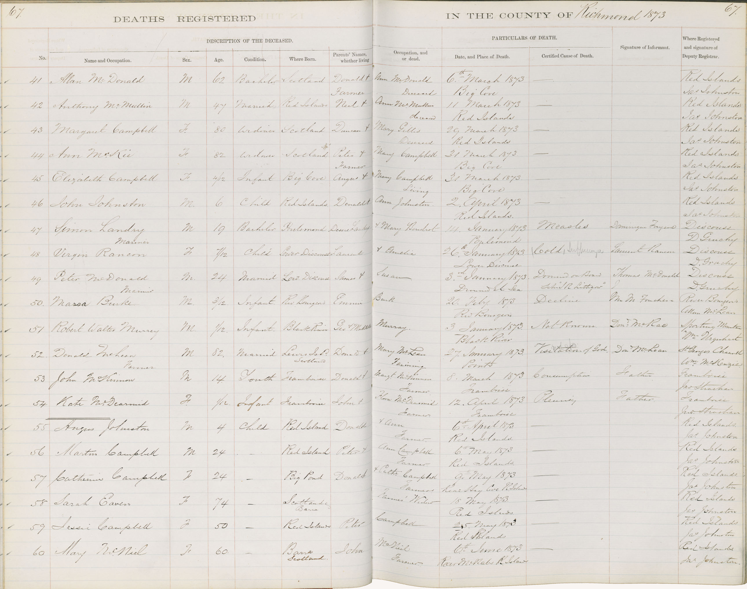 Death Registration: Year: 1873 book: 1815 page: 67 number: 41