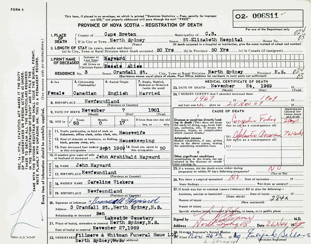 Female Death Registration: Year: 1969 number: 6811