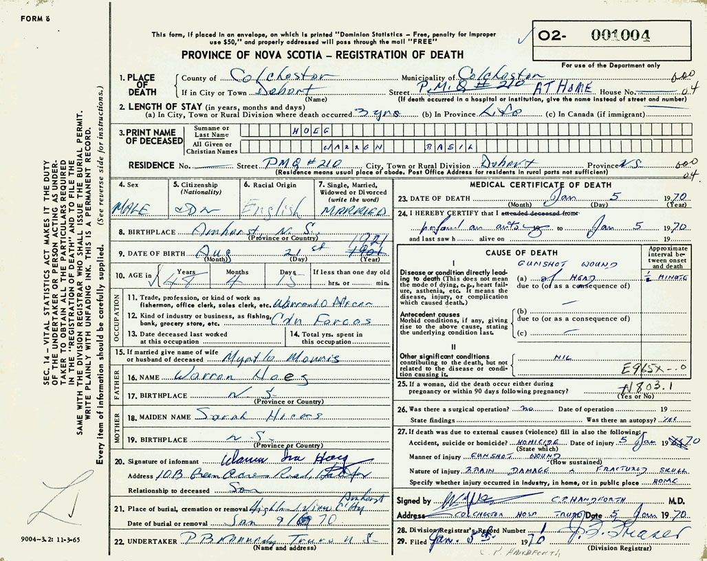 PROVINCE OF NOVA SCOTIA — REGISTRATION OF DEATH