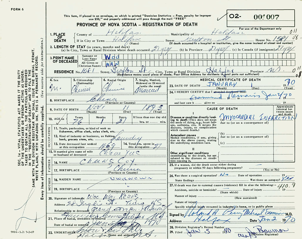 PROVINCE OF NOVA SCOTIA — REGISTRATION OF DEATH