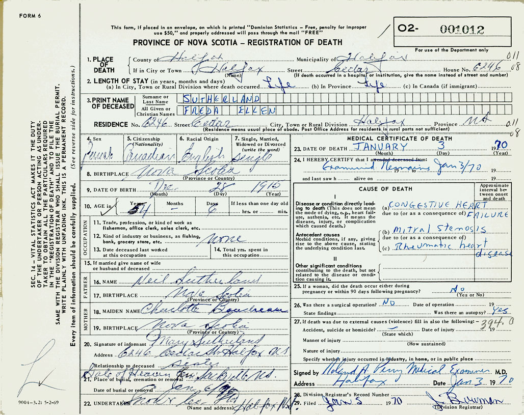 PROVINCE OF NOVA SCOTIA — REGISTRATION OF DEATH