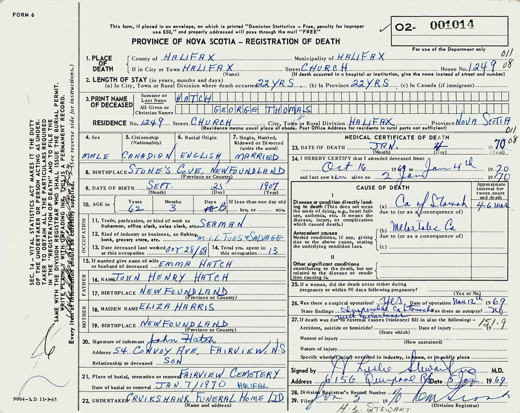 If death occured in a hospital or institution 1249 Church St., Halifax