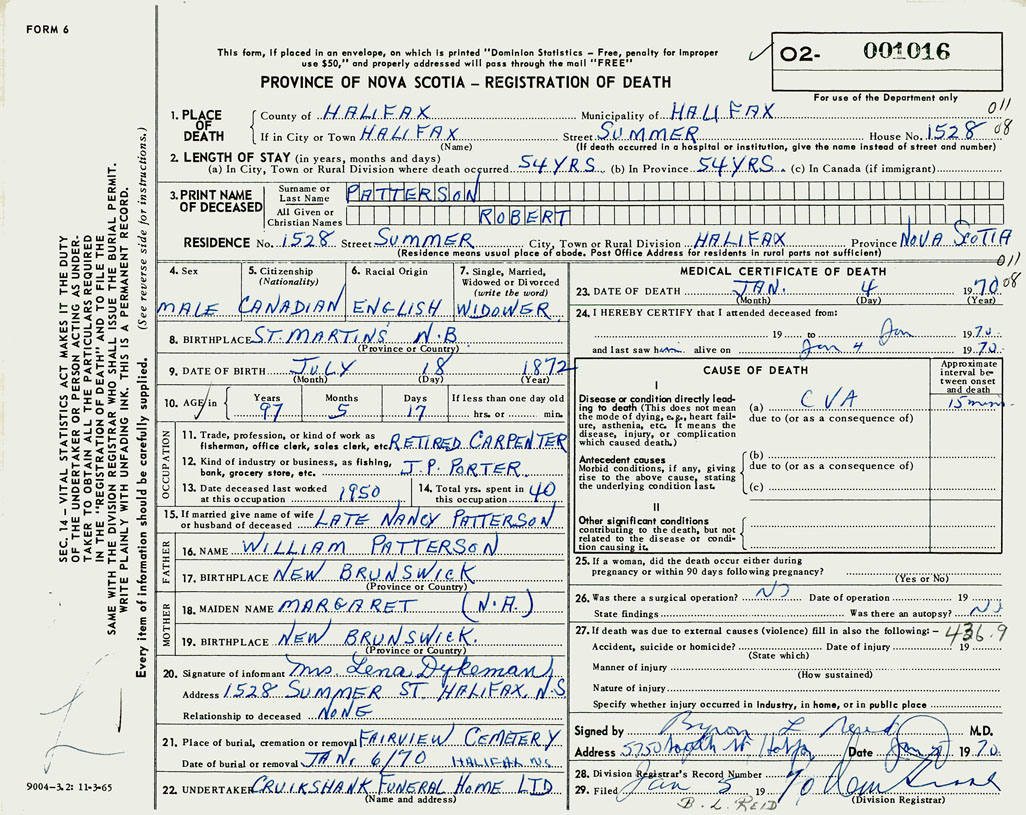 PROVINCE OF NOVA SCOTIA — REGISTRATION OF DEATH
