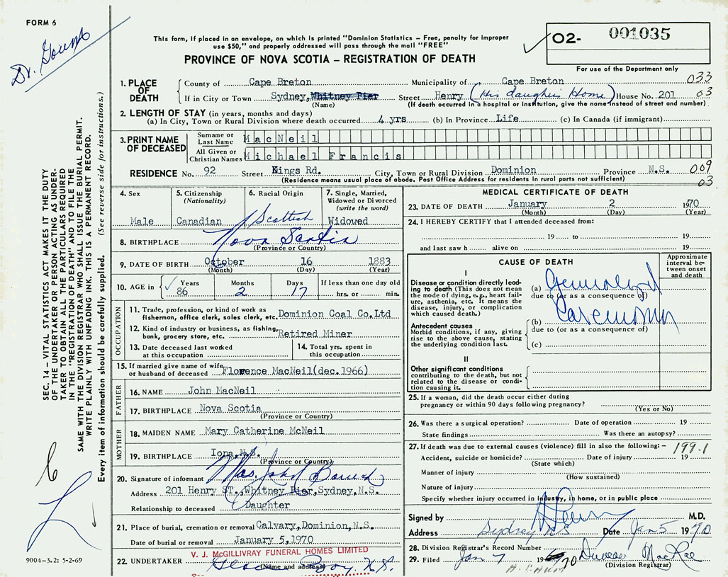 1. PLACE OF DEATH County of Cape Breton If in City or Town Sydney