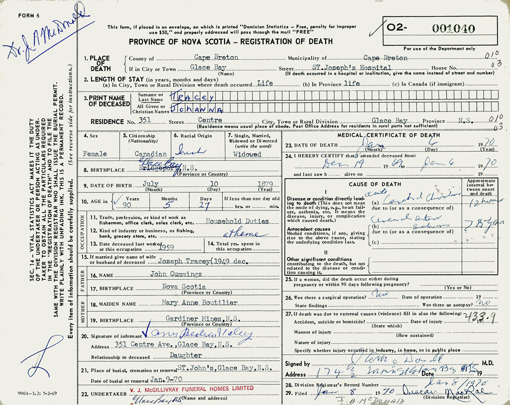 1. PLACE OF DEATH County of Cape If in City or Town Glace Bay