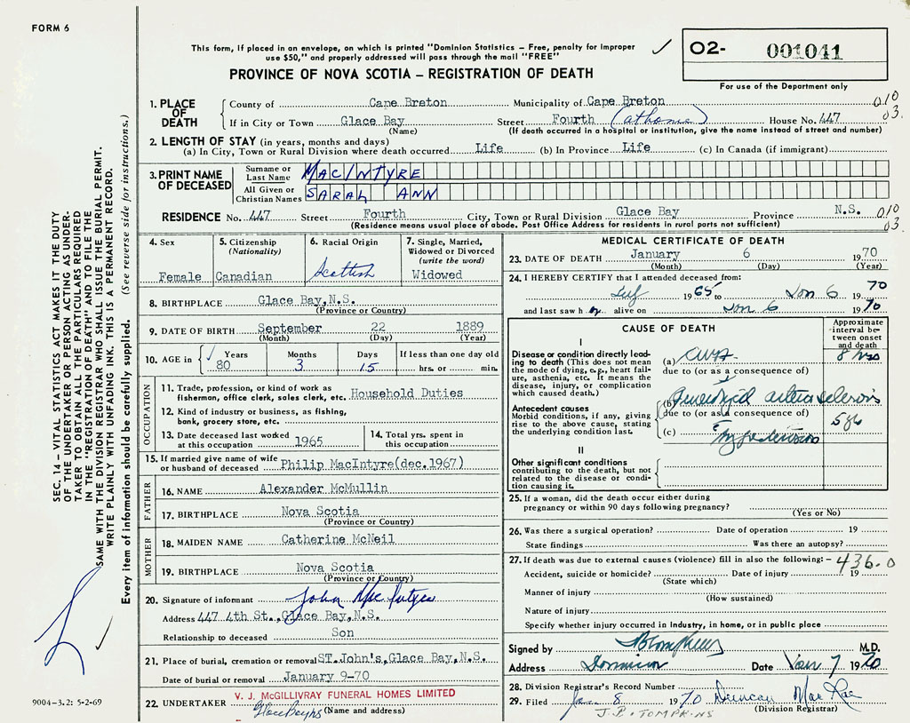 1. PLACE OF DEATH County of Cape Breton If in City or Town Glace Bay