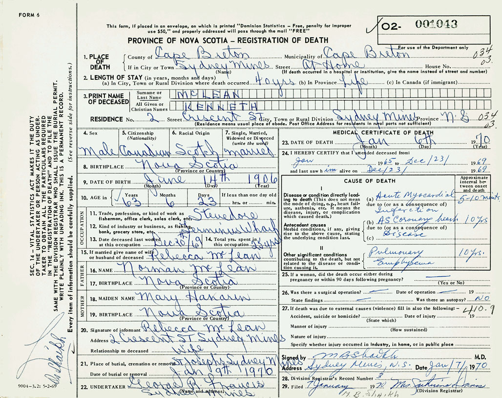 1. PLACE OF DEATH County of Cape Breton If in City or Town Sydney Mines
