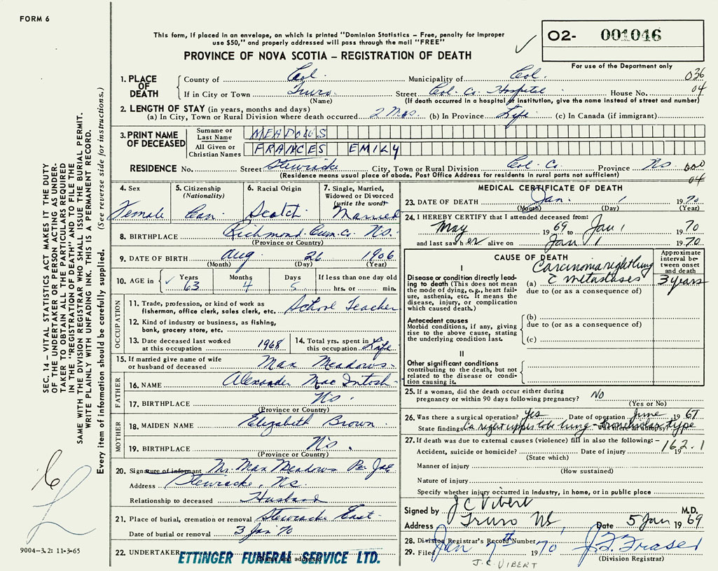 PROVINCE OF NOVA SCOTIA — REGISTRATION OF DEATH