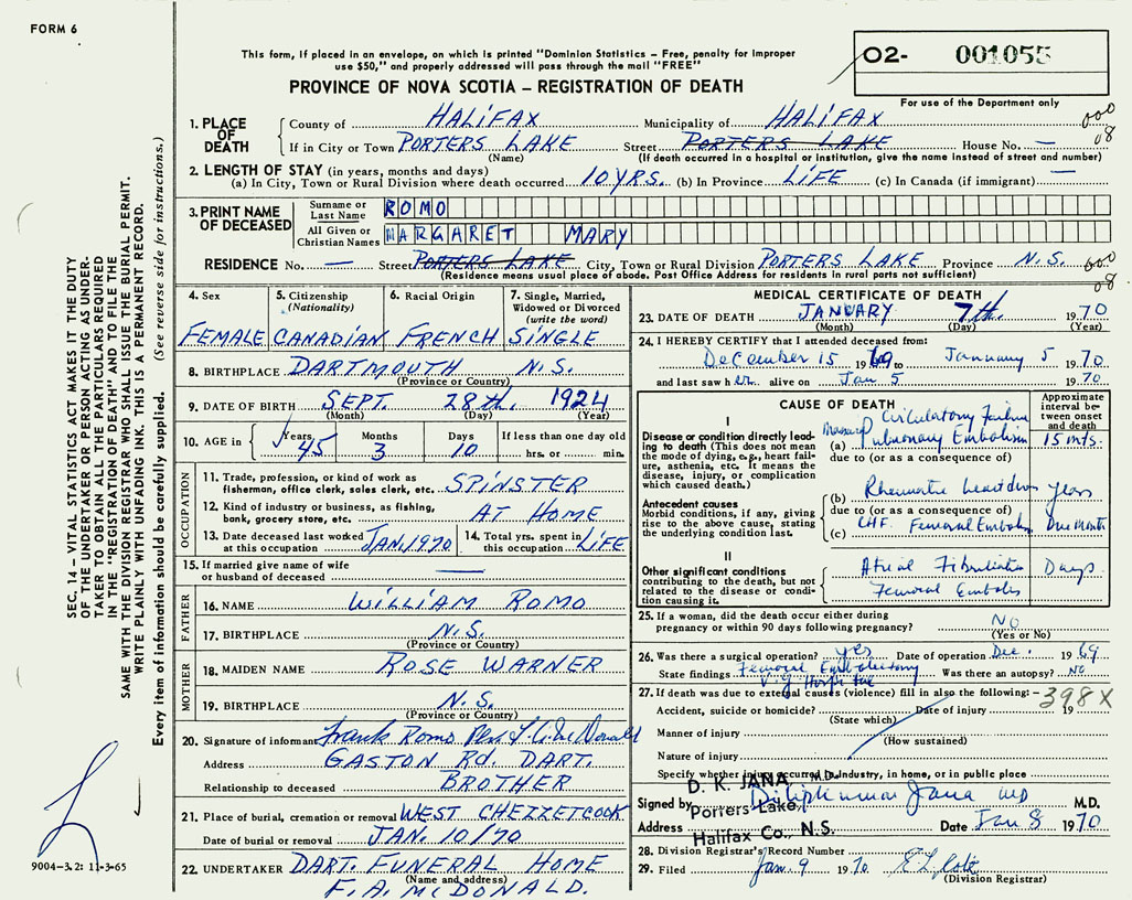 PROVINCE OF NOVA SCOTIA — REGISTRATION OF DEATH