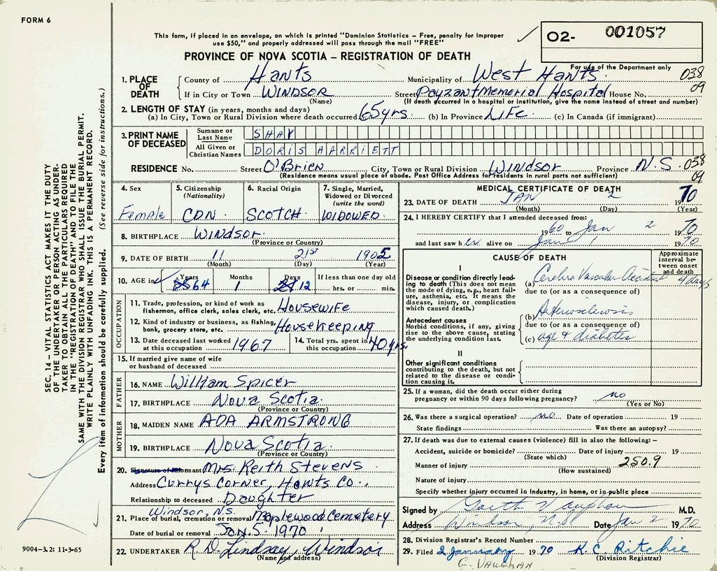 1. PLACE OF DEATH County of Hants If in City or Town Windsor