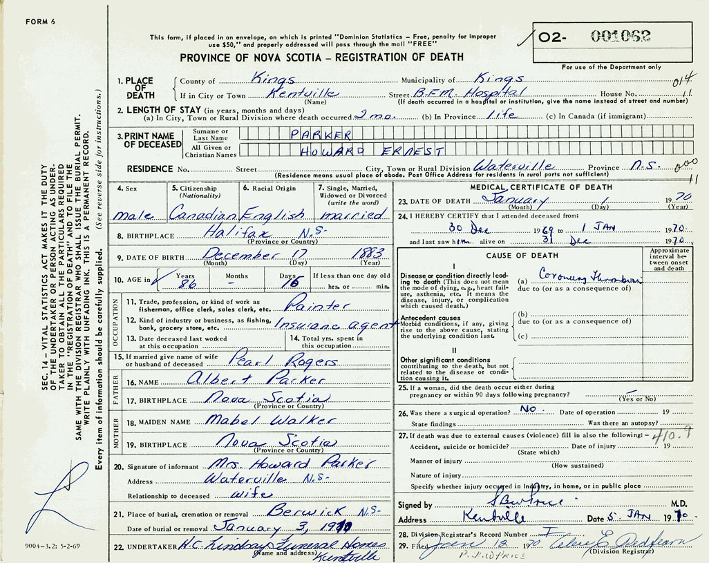PROVINCE OF NOVA SCOTIA — REGISTRATION OF DEATH