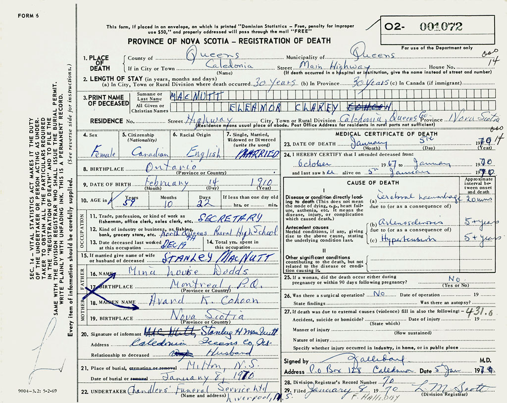 PROVINCE OF NOVA SCOTIA — REGISTRATION OF DEATH