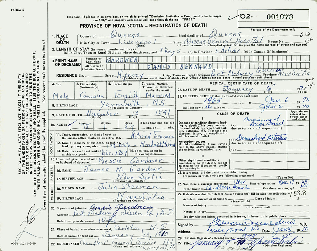PROVINCE OF NOVA SCOTIA — REGISTRATION OF DEATH