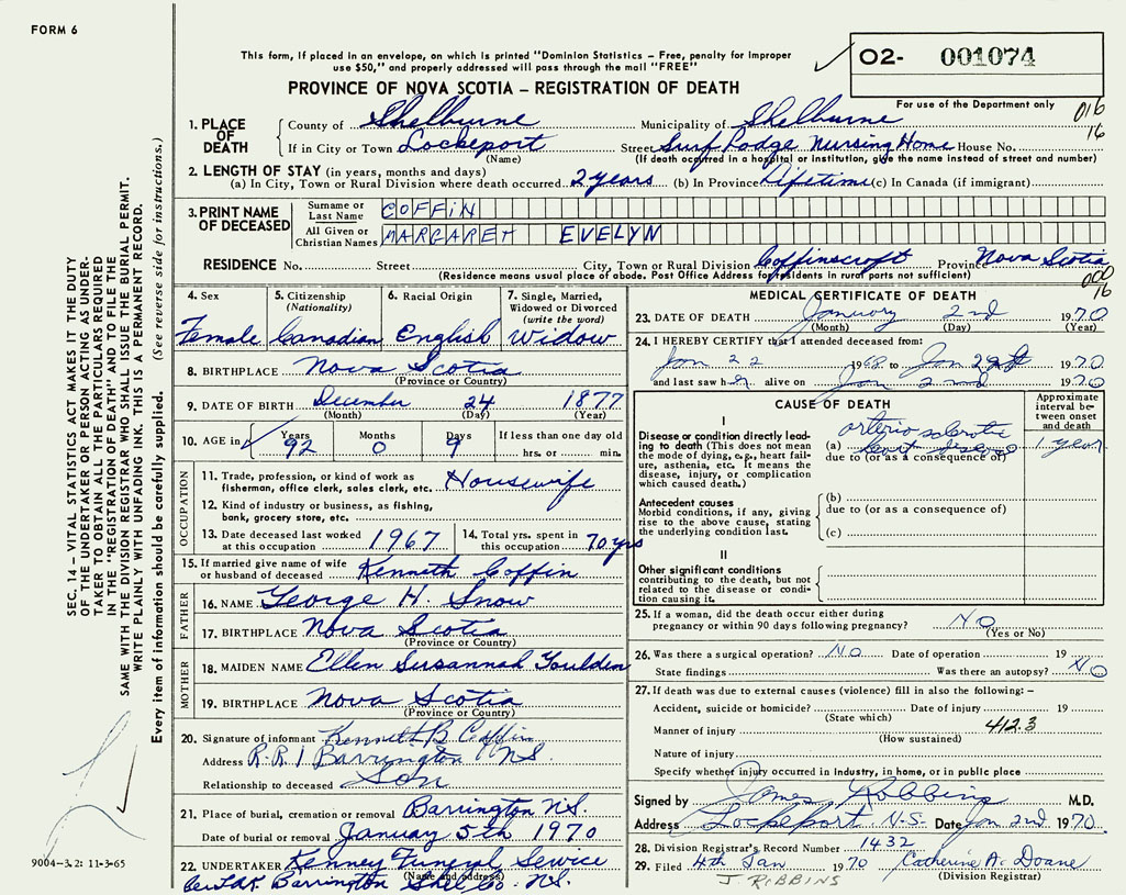 1. PLACE OF DEATH County of Shelburne If in City or Town Lockeport