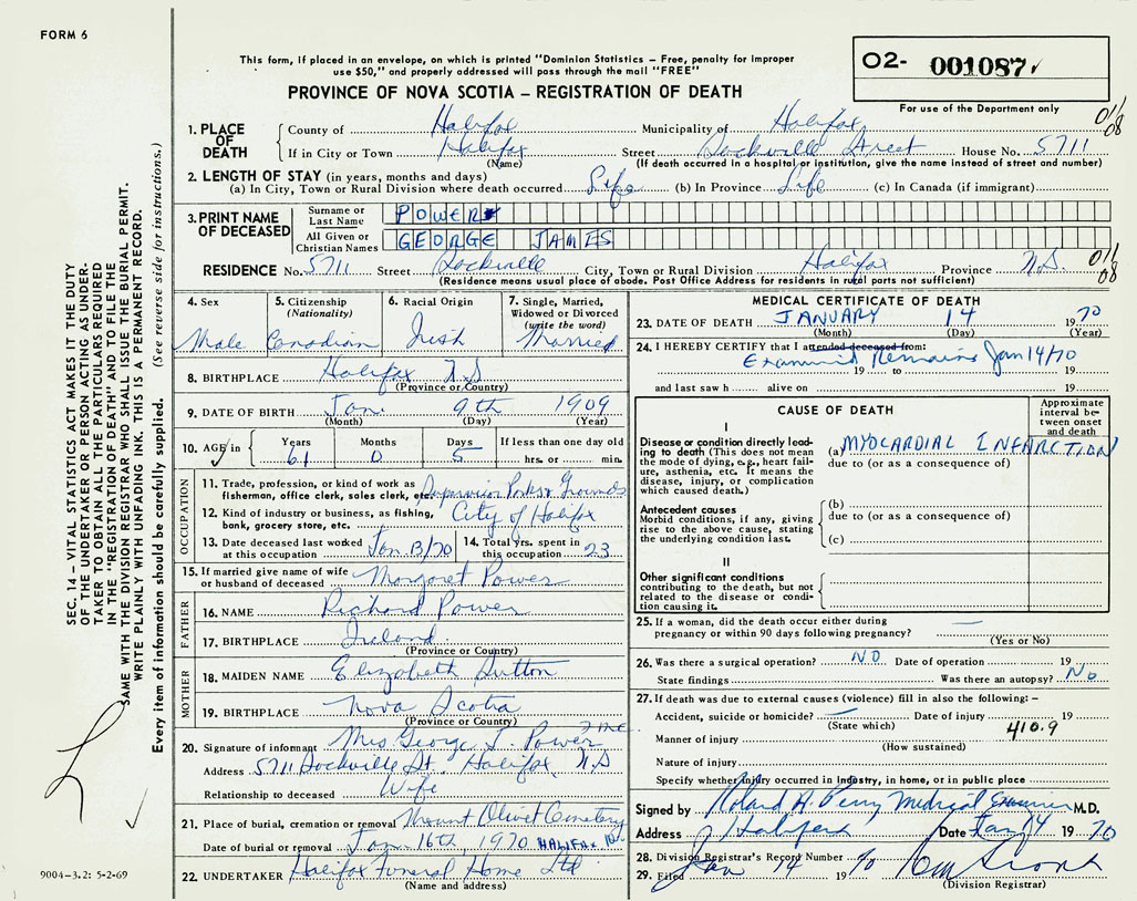 PROVINCE OF NOVA SCOTIA — REGISTRATION OF DEATH
