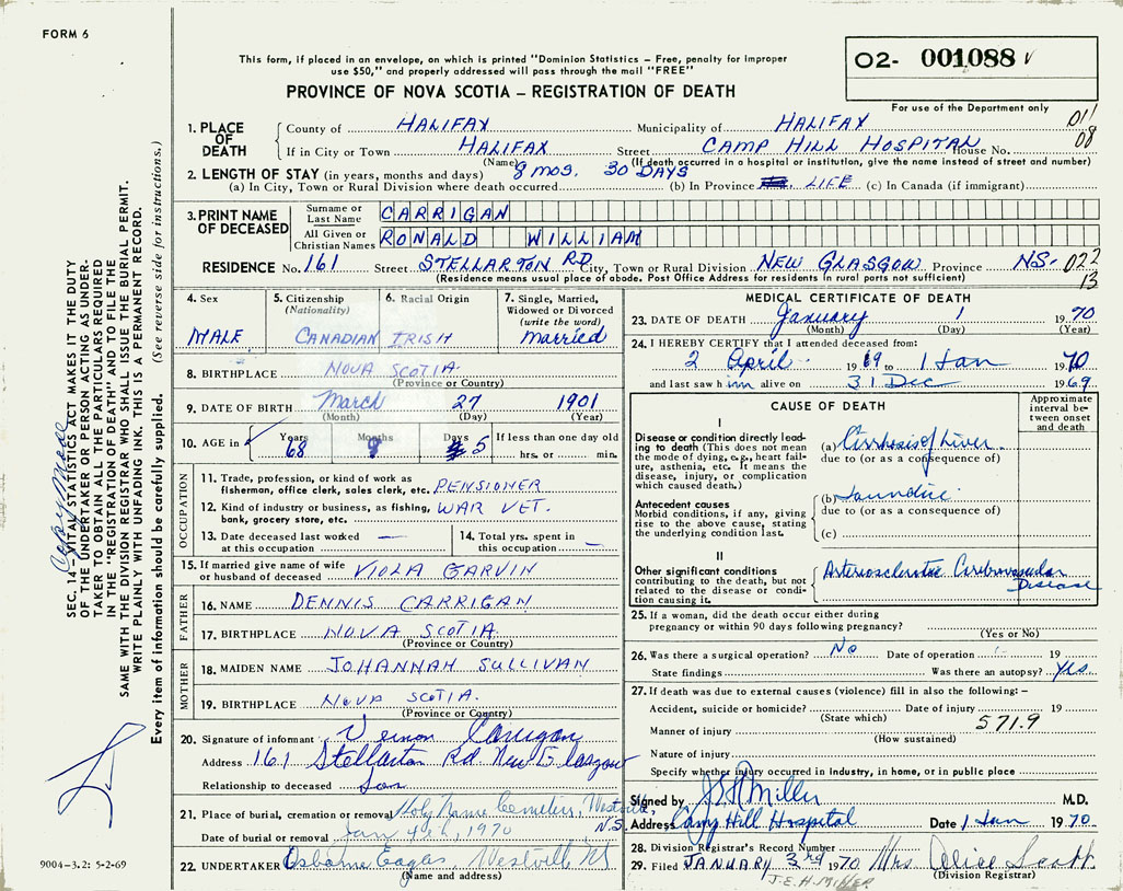 PROVINCE OF NOVA SCOTIA — REGISTRATION OF DEATH