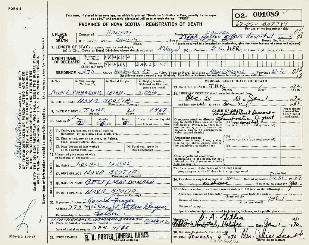 PROVINCE OF NOVA SCOTIA — REGISTRATION OF DEATH