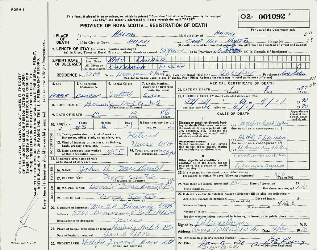 PROVINCE OF NOVA SCOTIA — REGISTRATION OF DEATH