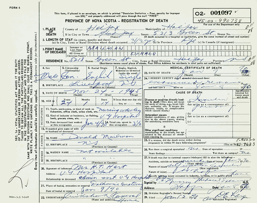 PROVINCE OF NOVA SCOTIA — REGISTRATION OF DEATH