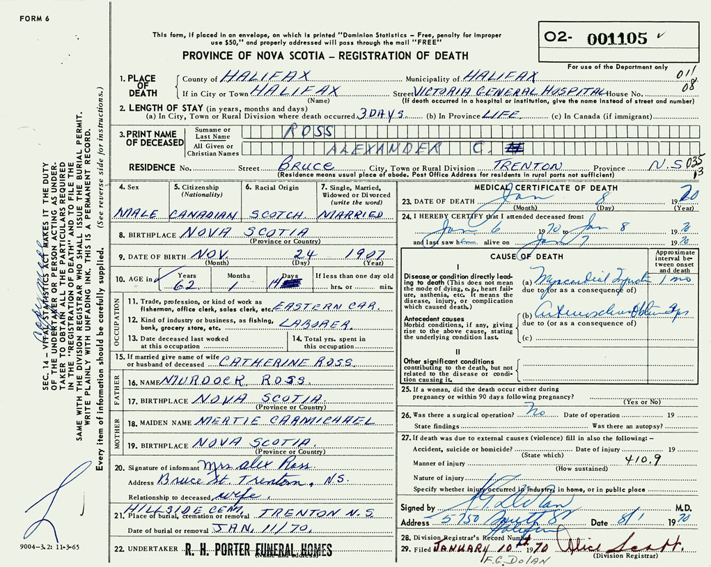 PROVINCE OF NOVA SCOTIA — REGISTRATION OF DEATH