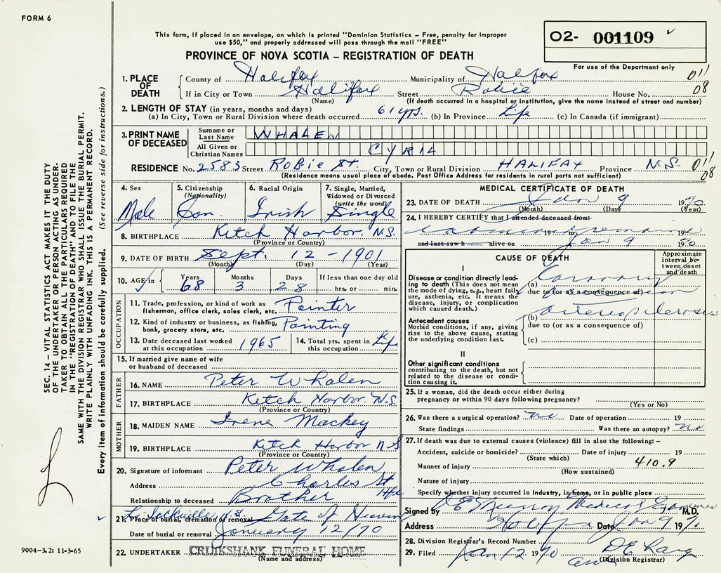 PROVINCE OF NOVA SCOTIA — REGISTRATION OF DEATH