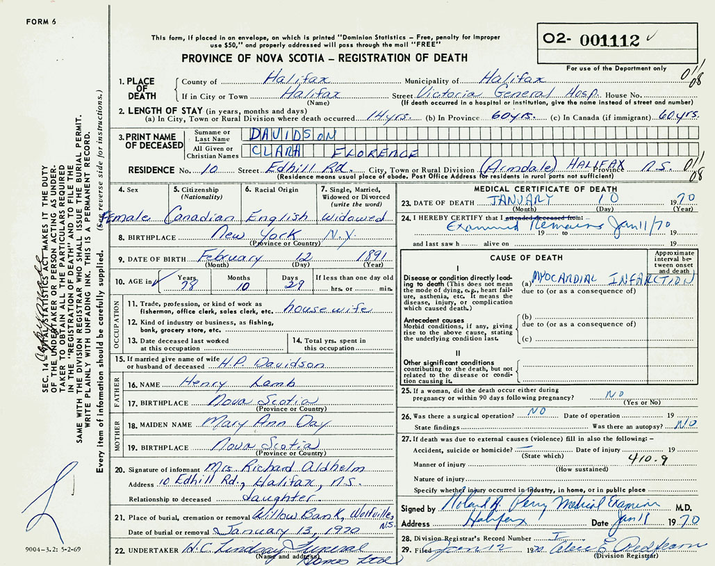 PROVINCE OF NOVA SCOTIA — REGISTRATION OF DEATH