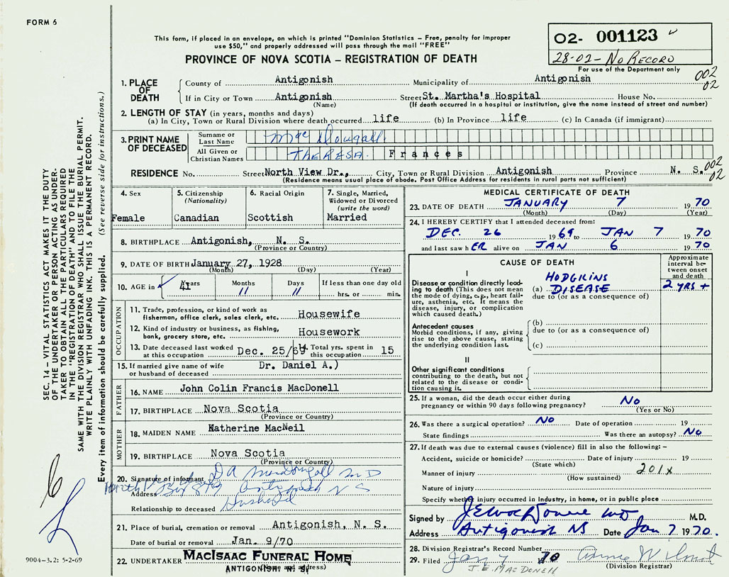 PROVINCE OF NOVA SCOTIA — REGISTRATION OF DEATH