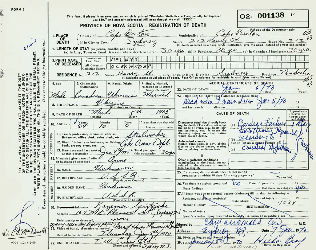 1. PLACE OF DEATH County of Cape Breton If in City or Town Sydney