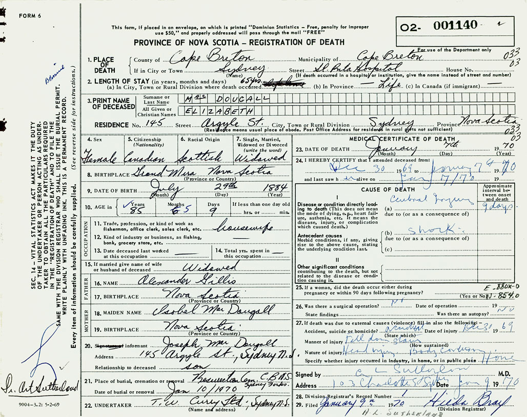 1. PLACE OF DEATH County of Cape Breton If in City or Town Sydney
