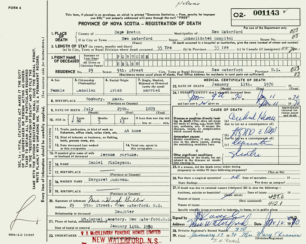1. PLACE OF DEATH County of Cape Breton If in City or Town New Waterford