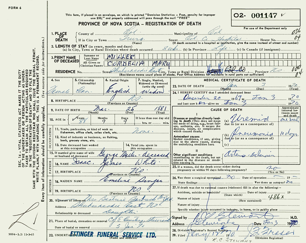 PROVINCE OF NOVA SCOTIA — REGISTRATION OF DEATH