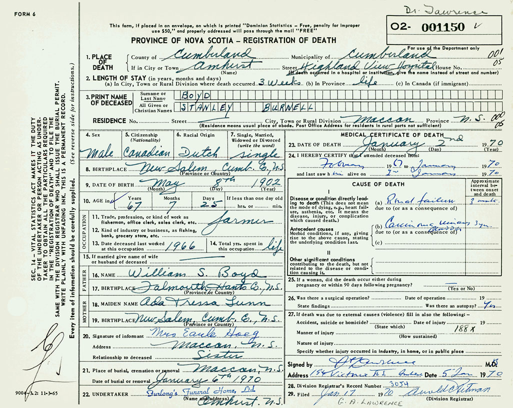 PROVINCE OF NOVA SCOTIA — REGISTRATION OF DEATH
