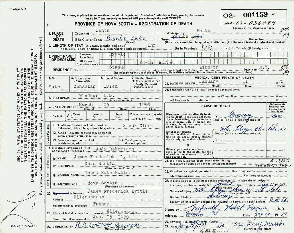 PROVINCE OF NOVA SCOTIA — REGISTRATION OF DEATH