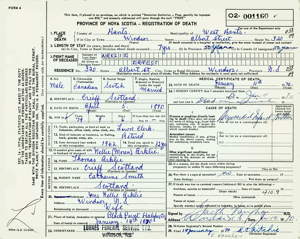 PROVINCE OF NOVA SCOTIA — REGISTRATION OF DEATH