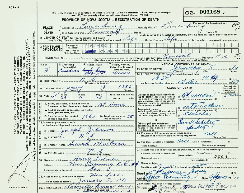 PROVINCE OF NOVA SCOTIA — REGISTRATION OF DEATH