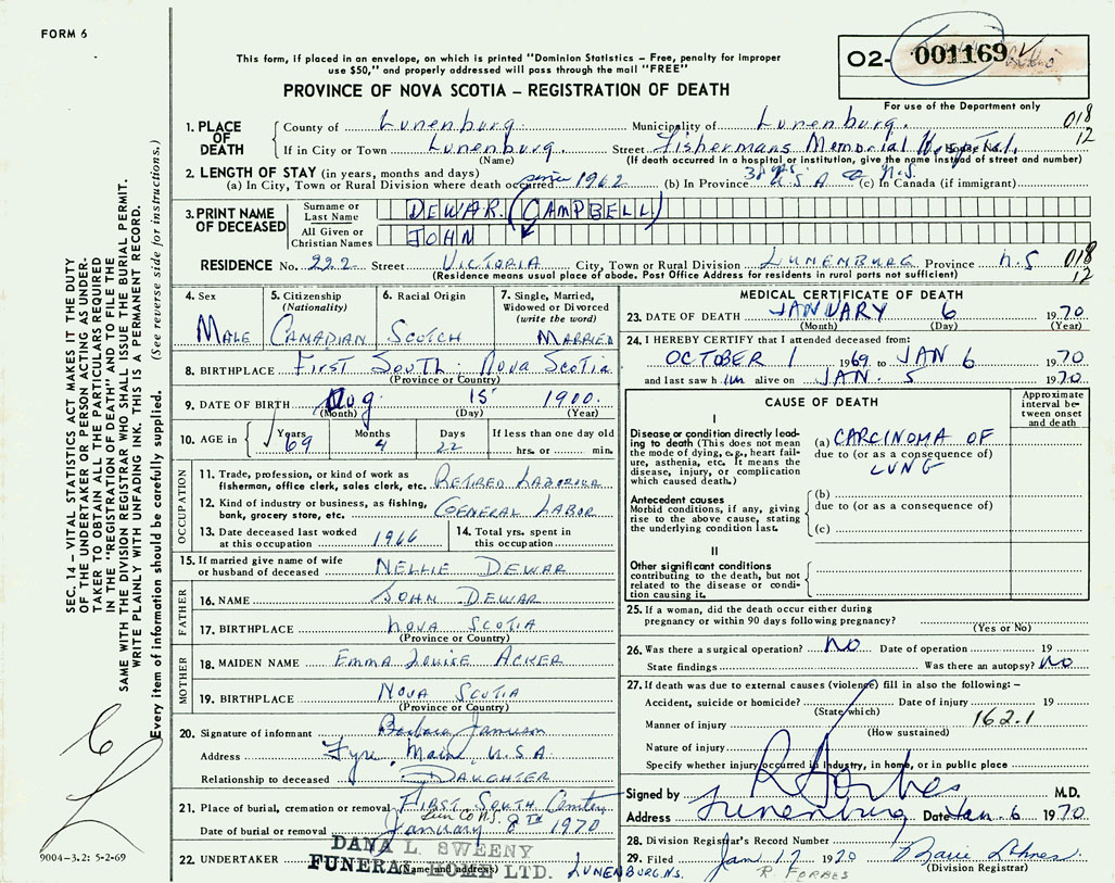 PROVINCE OF NOVA SCOTIA — REGISTRATION OF DEATH