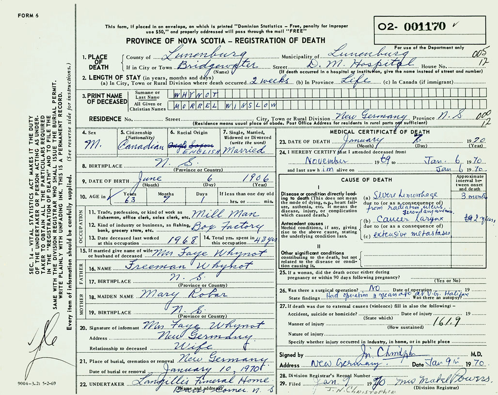 PROVINCE OF NOVA SCOTIA — REGISTRATION OF DEATH