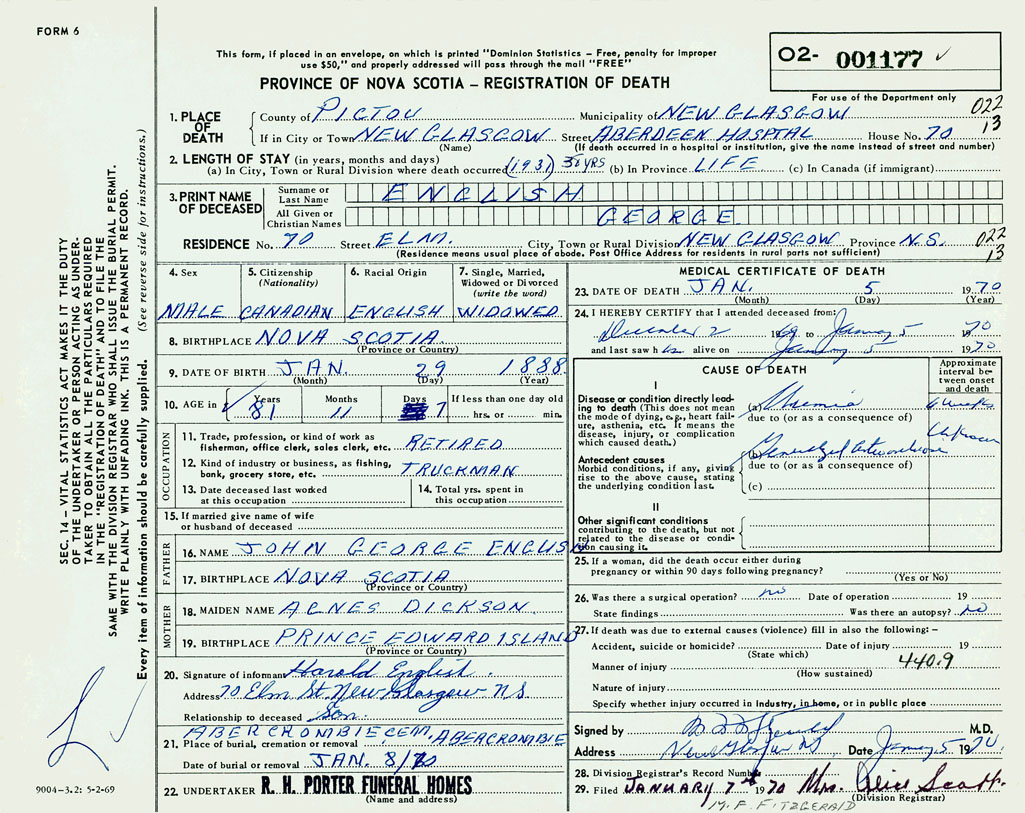 PROVINCE OF NOVA SCOTIA — REGISTRATION OF DEATH