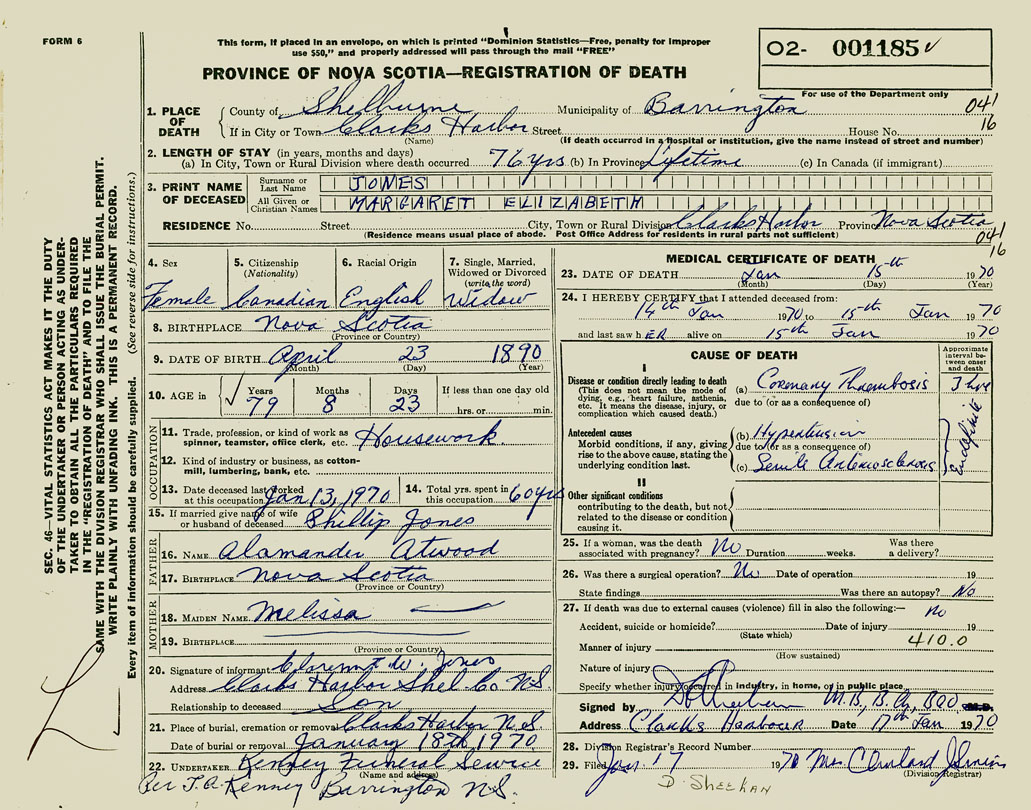 1. PLACE OF DEATH County of Shelburne If in City or Town Clarks Harbour