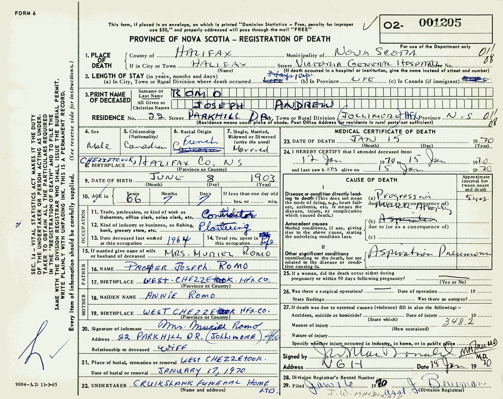 PROVINCE OF NOVA SCOTIA — REGISTRATION OF DEATH