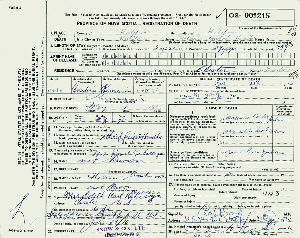 PROVINCE OF NOVA SCOTIA — REGISTRATION OF DEATH
